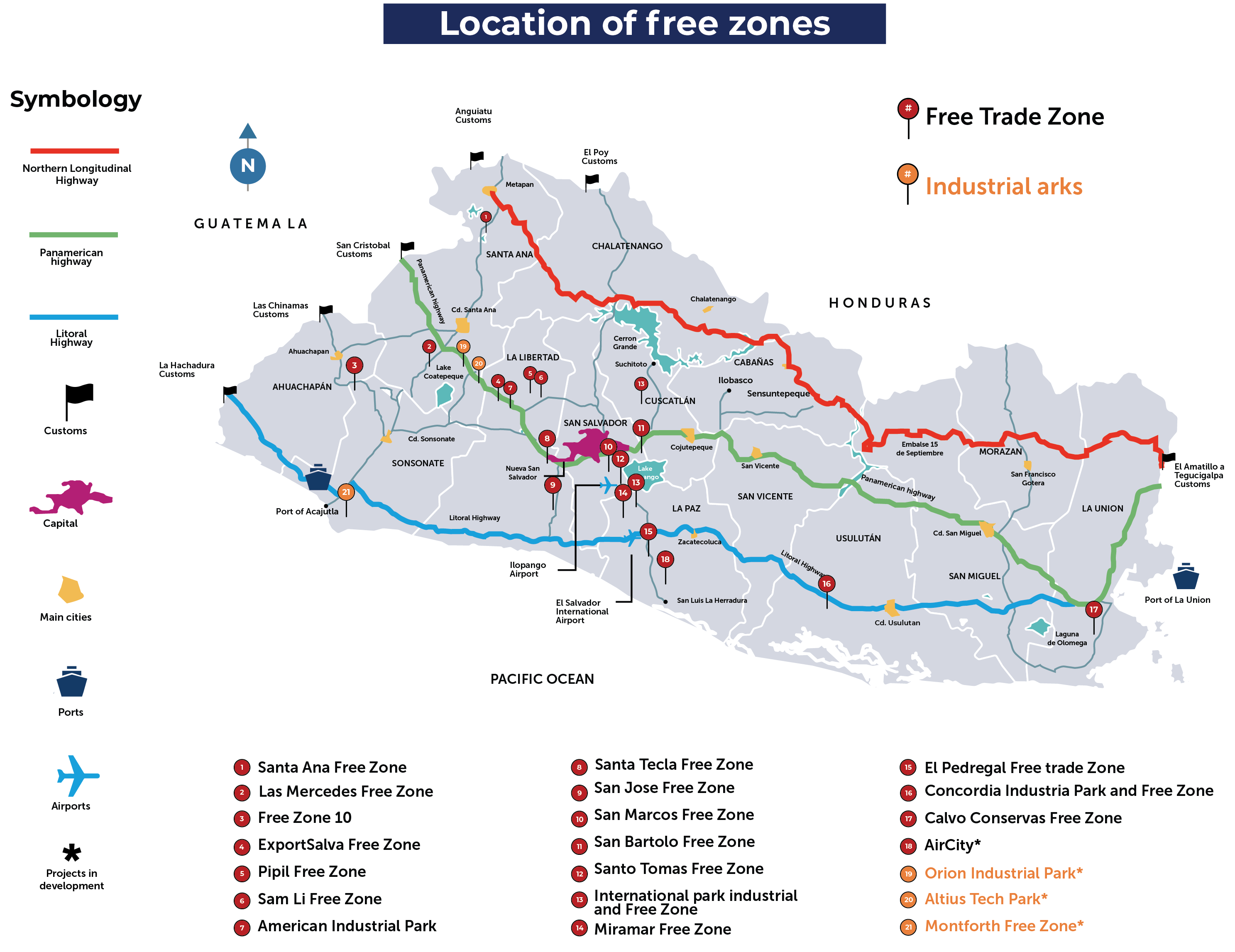 El Salvador ofrece a los inversionistas zonas francas diseñadas para empresas dedicadas a la producción y exportación de bienes o servicios. Estos parques industriales permiten operaciones eficientes y ofrecen atractivos incentivos fiscales, por ejemplo, las materias primas o mercancías que necesitan las empresas se importan libres de impuestos y aranceles.